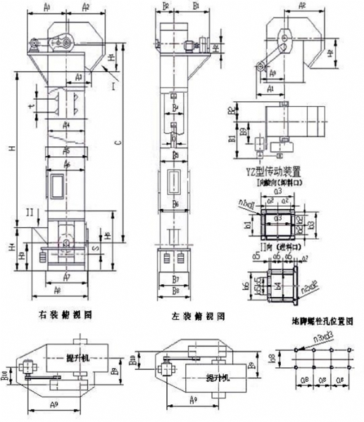 該鬥式提升機傳動裝置有二種形式,分別配有ZJ型減速器和ZQ型減速器。ZJ型軸(zhóu)裝減速器直接(jiē)套裝在(zài)主軸軸頭上,省去了提升機傳動平台、聯軸器等,使TH型鬥式提升機結構緊湊、重量輕,而且內(nèi)部帶有異型輥逆止器,逆止可靠,該減速器噪聲低,運轉平穩,並隨主軸浮動,可消除安裝應力。本機輸送量365m3/h,提升高度為50m。